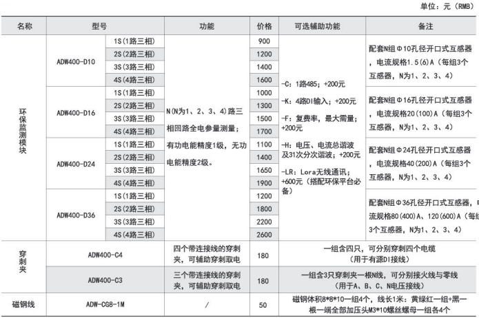 ADW400方便用戶進(jìn)行用電監(jiān)測(cè)、集抄和管理,特別適合環(huán)保監(jiān)管類的廠區(qū)智能監(jiān)管改造項(xiàng)目,可廣泛應(yīng)用于化工廠、制藥廠、鋼鐵廠、養(yǎng)殖廠等產(chǎn)污制污的工廠。訂貨范例: