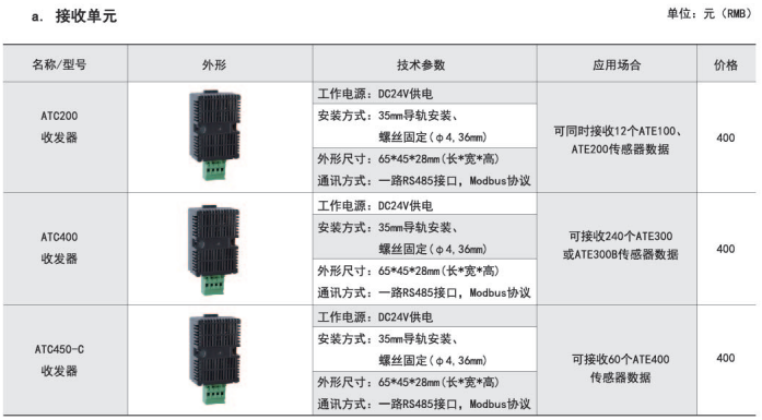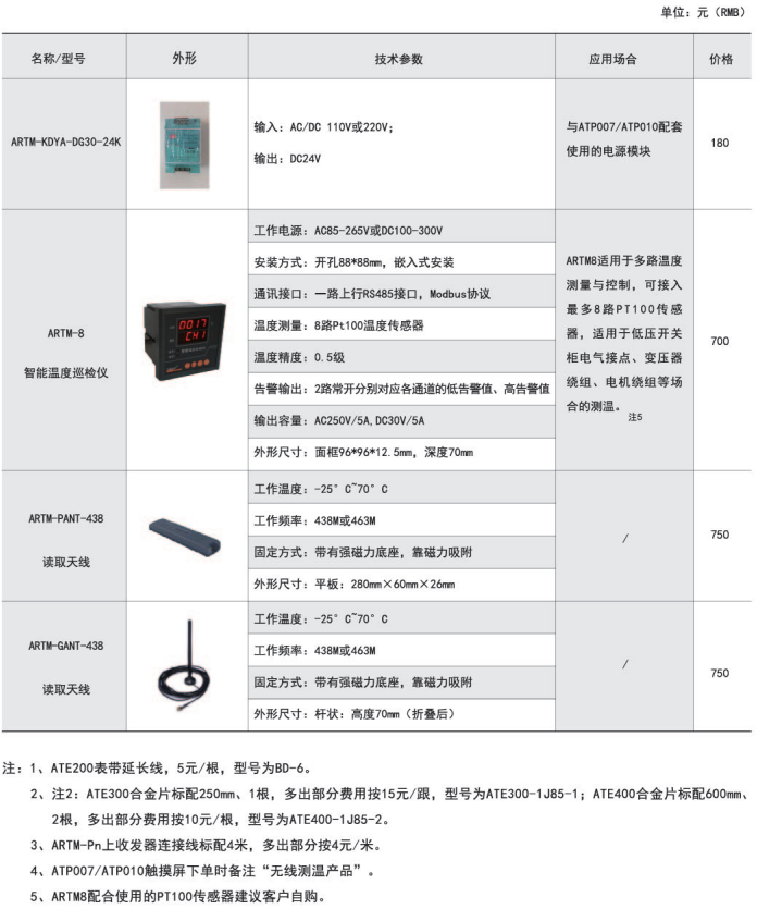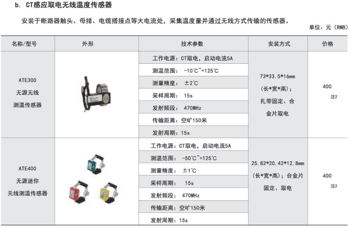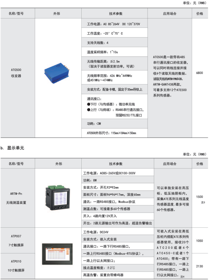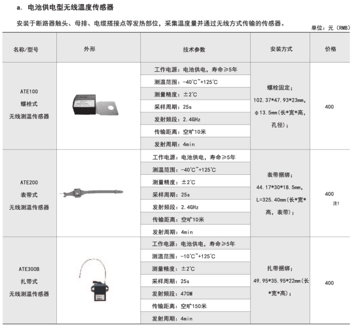 ARTM-Pn無線測溫裝置:ARTM-Pn無線測溫裝置可以單獨安裝在高壓柜、低壓抽屜柜內,每臺裝置可以接收18個傳感器的數據,傳感器型號可選配ATE100、ATE200、ATE300。裝置帶有一路485接口,可將采集到的溫度數據上傳到監控中心。應用范圍:
