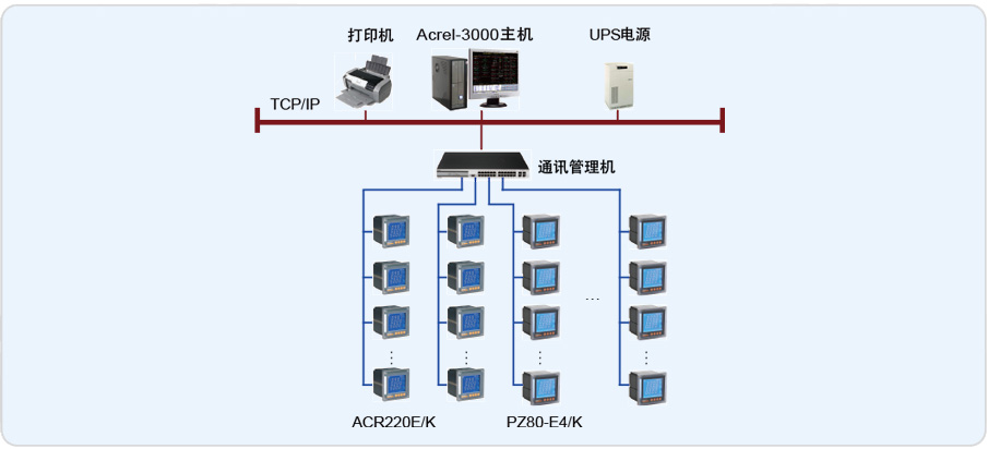 四川機械設計制造研究所主站層位于一層總值班室內,電力監控系統的站控管理層設備具體包括:Acrel-2000電力監控系統工控機一套、打印機、UPS。負責將通訊管理層上傳的數據解包,進行集中管理和分析,執行相關操作、以及整個變配電系統的整體監控。網絡通訊層設備的選型主要從兩個方面考慮,一個是用戶需求,功能實現方面;二是根據現場情況,綜合項目的費用來考慮的。針對這個項目來說網絡通訊層設備采用性價比高的4口帶隔離的通訊管理機。兩路進線選擇的是安科瑞生產的ACR220E/K網絡電力儀表;出線回路選擇的是安科瑞生產的PZ80-E4/K。