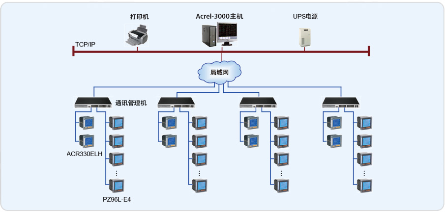 該系統(tǒng)總計有79只儀表(其中包括8只ACR330ELH諧波儀表,71只PZ系列智能儀表),分8條總線,由于四個變電所之間距離較遠,并且較為分散,采用每個變電所內(nèi)自行組網(wǎng),然后并入惠氏公司內(nèi)部局域網(wǎng)的方式,實該現(xiàn)場總線上儀表與監(jiān)控主機的數(shù)據(jù)連通。