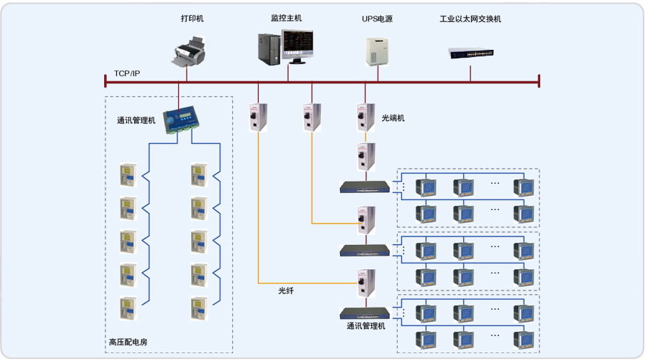 系統(tǒng)采用分層分布式結(jié)構(gòu),在高壓配電房設(shè)置一臺4口的通訊管理機(jī),采用RS485總線將網(wǎng)絡(luò)儀表接入通訊管理機(jī),直接與交換機(jī)相連,進(jìn)行數(shù)據(jù)上傳;在每個低壓配電室設(shè)置一臺16口通訊管理機(jī),采用RS485總線將網(wǎng)絡(luò)儀表接入通訊管理機(jī),再通過光纖傳輸,將采集的所有現(xiàn)場設(shè)備的數(shù)據(jù)傳至監(jiān)控主機(jī),實現(xiàn)遠(yuǎn)程電參量實時監(jiān)測。
