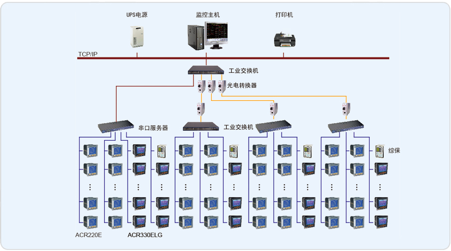 Acrel–3000軟件通過中間采集設備采集現場電力監控儀表數據,并在系統一次圖顯示出來。主要實現功能如:遠程抄表查,詢各個配電室各個回路按照時間段進行歷史數據查詢。趨勢曲線,功率實時趨勢顯示及歷史趨勢查詢功能。系統遙信狀態報警,根據本系統的設計意圖,如果重要回路或者照明回路三相中某一相電流負荷超過額定值的90%,系統需要立刻發出聲光報警并彈出指示框指明報警源,提醒管理人員注意負載的三相平衡和負載率,同時自動記錄事件發生的時間和回路名稱,以便用戶查詢,追憶故障原因。