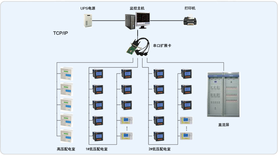 整個(gè)系統(tǒng)采用分布式結(jié)構(gòu),高壓配電室、低壓配電室1#、低壓配電室2#內(nèi)現(xiàn)場(chǎng)設(shè)備均采用RS485總線直接接入監(jiān)控主機(jī)擴(kuò)展卡的串口。對(duì)于每個(gè)回路采用ACR多功能儀表,共126個(gè)回路;站控層應(yīng)用國(guó)內(nèi)知名的聯(lián)想商用計(jì)算機(jī)作為監(jiān)控主機(jī),同時(shí)設(shè)有用于報(bào)表打印輸出的打印機(jī);防止異常斷電而引發(fā)的數(shù)據(jù)丟失的UPS設(shè)備。監(jiān)控軟件平臺(tái)采用單機(jī)版Acrel-3000型電能管理系統(tǒng)。Acrel-3000型電能管理系統(tǒng)預(yù)留了擴(kuò)展接口,可方便進(jìn)行擴(kuò)展。