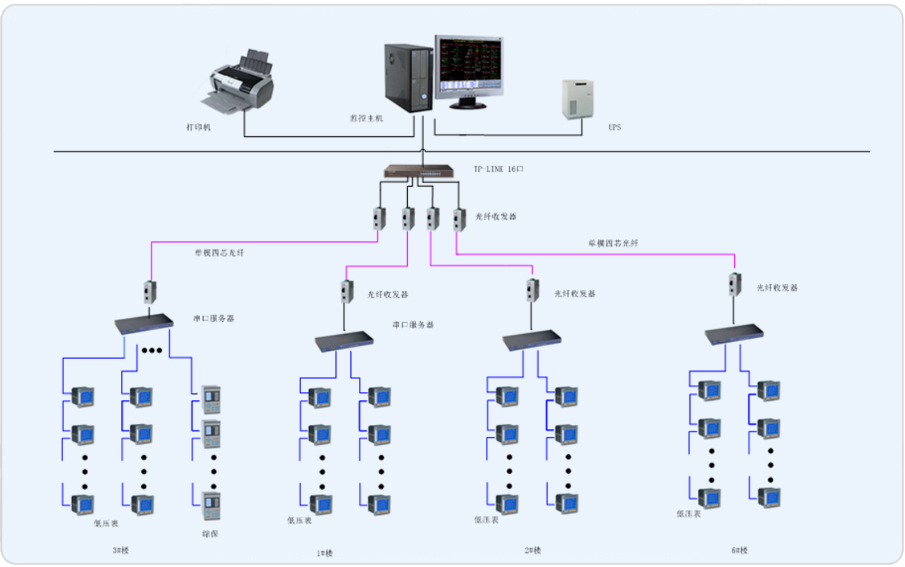 本次項目為制造工程技術(shù)大樓的電力監(jiān)控系統(tǒng)。通過利用原本已安裝的智能儀表,將原非智能儀表更換為智能儀表。通過組建系統(tǒng)網(wǎng)絡(luò),實時監(jiān)測變電所內(nèi)各個回路的電流、電壓、功率、開關(guān)狀態(tài)等電參量,由此達(dá)到變電所少人值守或無人值守的智能化管理。