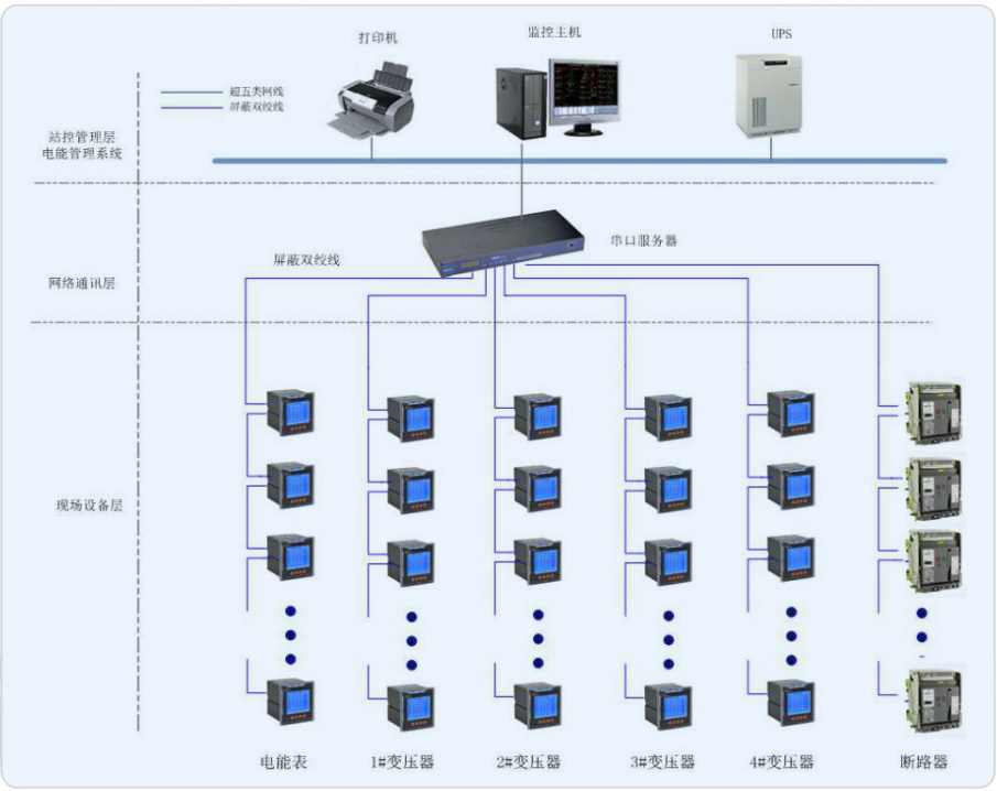 系統(tǒng)應通過多功能的電力監(jiān)控裝置、通訊網(wǎng)絡和計算機軟件,實現(xiàn)醫(yī)院內(nèi)供配電系統(tǒng)在運行過程中的數(shù)據(jù)采集、運行監(jiān)視、事故預警、事故記錄和分析、電能質(zhì)量檢測、三相不平衡監(jiān)視、繼電保護等,完成醫(yī)院的安全供電、用電管理、設備管理和運行管理。系統(tǒng)由主控層、通訊管理層和現(xiàn)場控制層構成。系統(tǒng)要求盡量減少集中采集數(shù)據(jù)的裝置以保證系統(tǒng)的通訊可靠性。