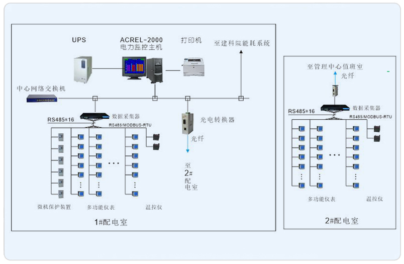 系統(tǒng)采用Acrel-2000型電力監(jiān)控系統(tǒng),監(jiān)控主機(jī)位于1#配電室內(nèi)電力監(jiān)控值班室,2#配電房距離值班室較遠(yuǎn),通過(guò)通訊管理機(jī)將采集的數(shù)據(jù)經(jīng)處理后經(jīng)光纖收發(fā)器和光纜上傳至位于1#配電室內(nèi)電力監(jiān)控值班室;所有配電回路均配備安科瑞電力儀表ACR系。該項(xiàng)目實(shí)現(xiàn)了13號(hào)地塊電力系統(tǒng)的智能管理。所有監(jiān)控設(shè)備均通過(guò)屏蔽雙絞線至各自配電室內(nèi)的通訊管理機(jī),再通過(guò)光電轉(zhuǎn)換器經(jīng)過(guò)光纖將數(shù)據(jù)傳輸至1#配電室內(nèi)電力監(jiān)控值班室,從而實(shí)現(xiàn)遠(yuǎn)程監(jiān)控。