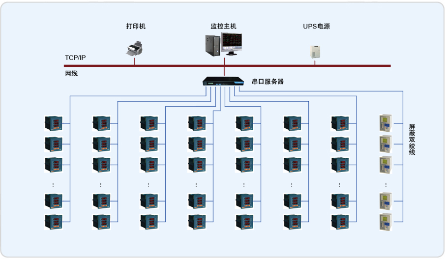 Acrel–2000軟件通過中間采集設備采集現場電力監(jiān)控儀表數據,并在系統(tǒng)一次圖顯示出來。主要實現功能如:遠程抄表查,詢各個配電室各個回路按照時間段進行歷史數據查詢。趨勢曲線,功率實時趨勢顯示及歷史趨勢查詢功能。系統(tǒng)遙信狀態(tài)報警,根據本系統(tǒng)的設計意圖,如果重要回路或者照明回路三相中某一相電流負荷超過額定值的90%,系統(tǒng)必須立刻發(fā)出聲光報警并彈出指示框指明報警源,提醒管理人員注意負載的三相平衡和負載率,同時自動記錄事件發(fā)生的時間和回路名稱,以便用戶查詢,追憶故障原因。