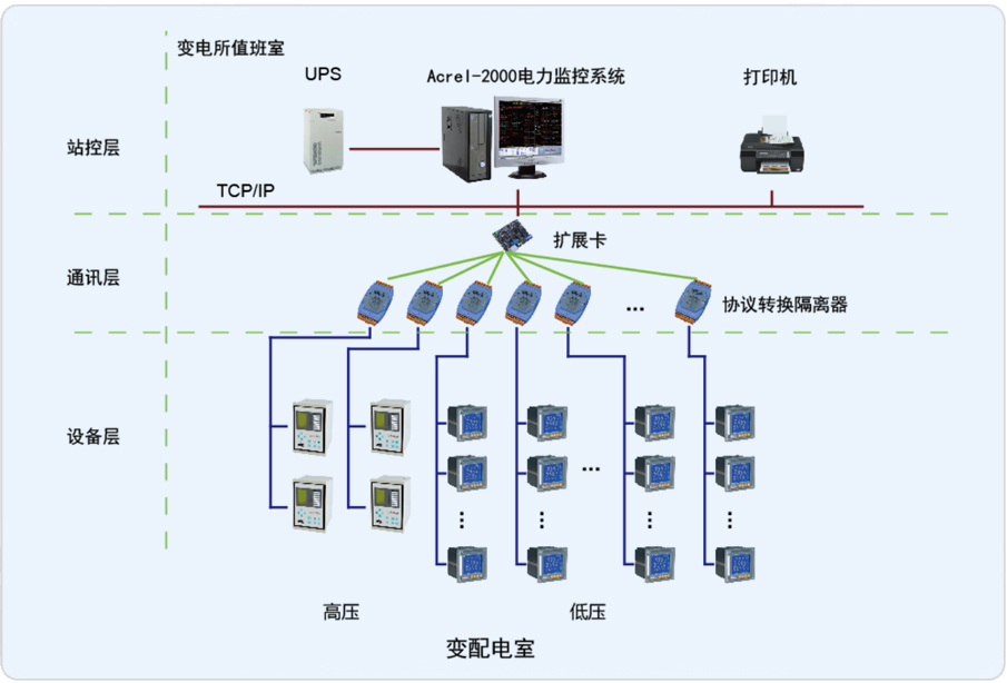 本項目承接其10KV配電增容改造變電所部分電力監控系統,其中有兩路高壓進線,配有綜合保護裝置,低壓部分,進線柜、饋線柜配有儀表。通過Acrel-2000電力監控系統,實時監測變電所內各個回路的電流、電壓、功率、開關狀態等電參量,由此達到變電所少人值守或無人值守的智能化管理。